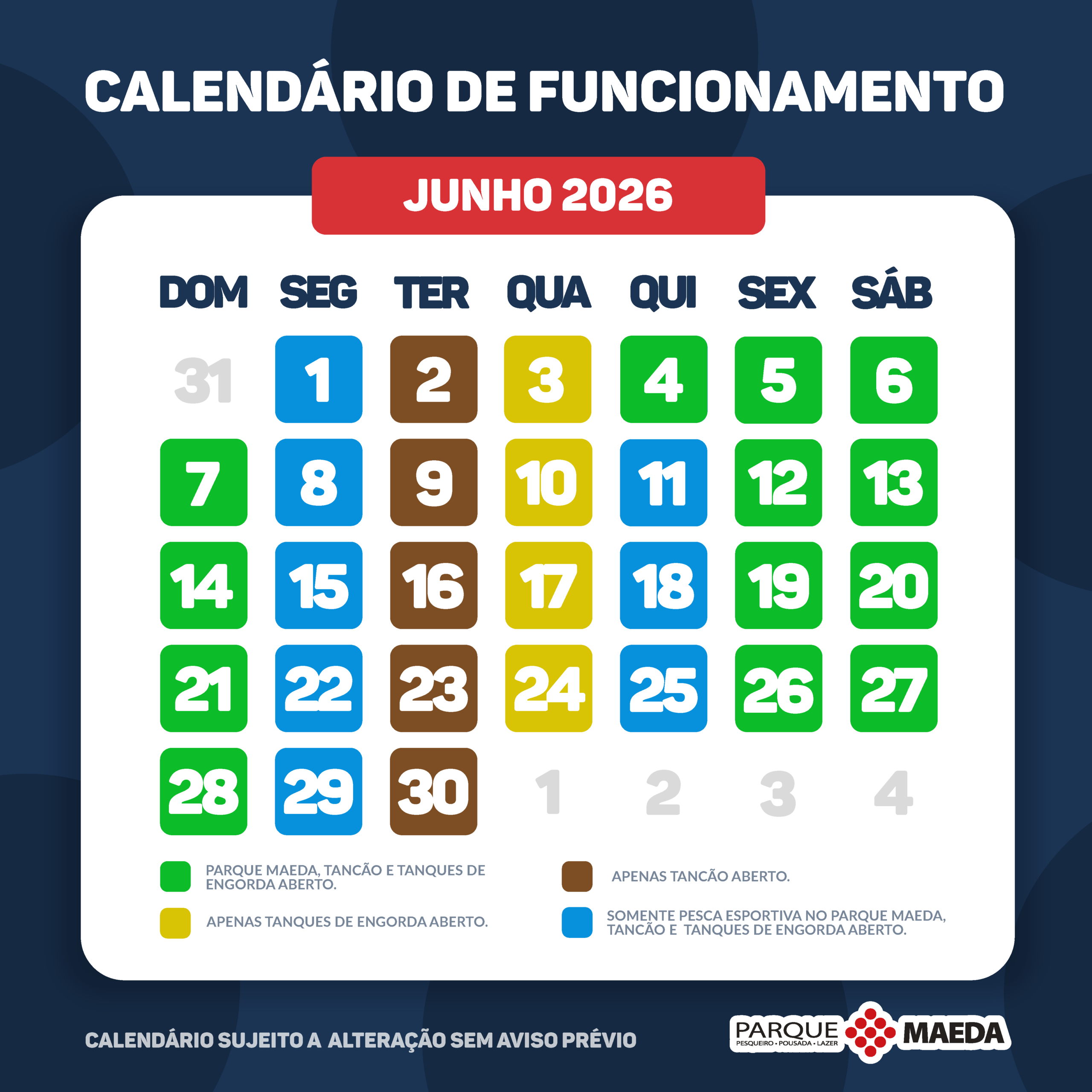 Calendários sujeitos à alteração sem aviso prévio.